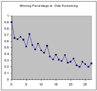 First of all, a couple of simple graphs. Here's the relationship between the outs remaining when the starter comes out and winning percentage: